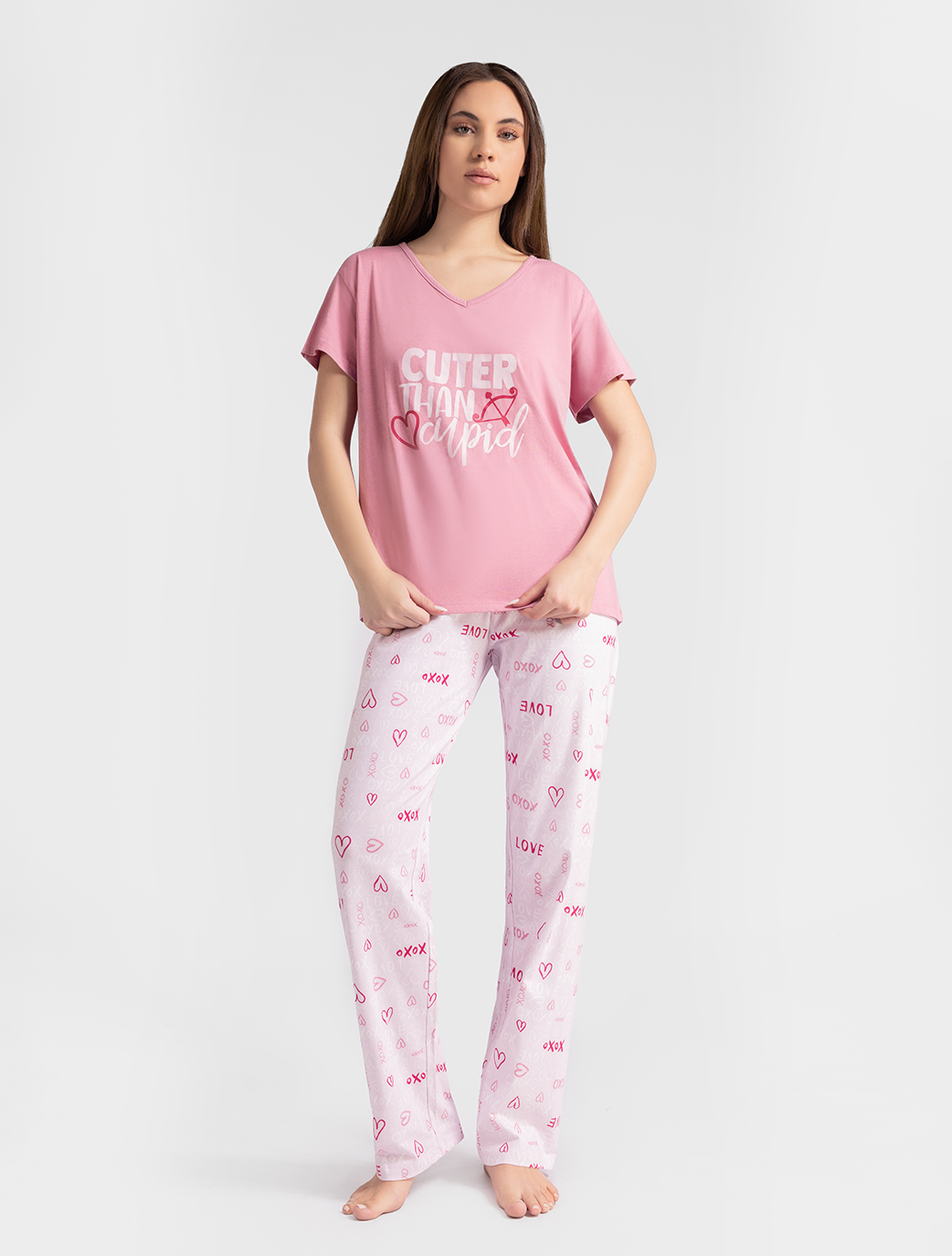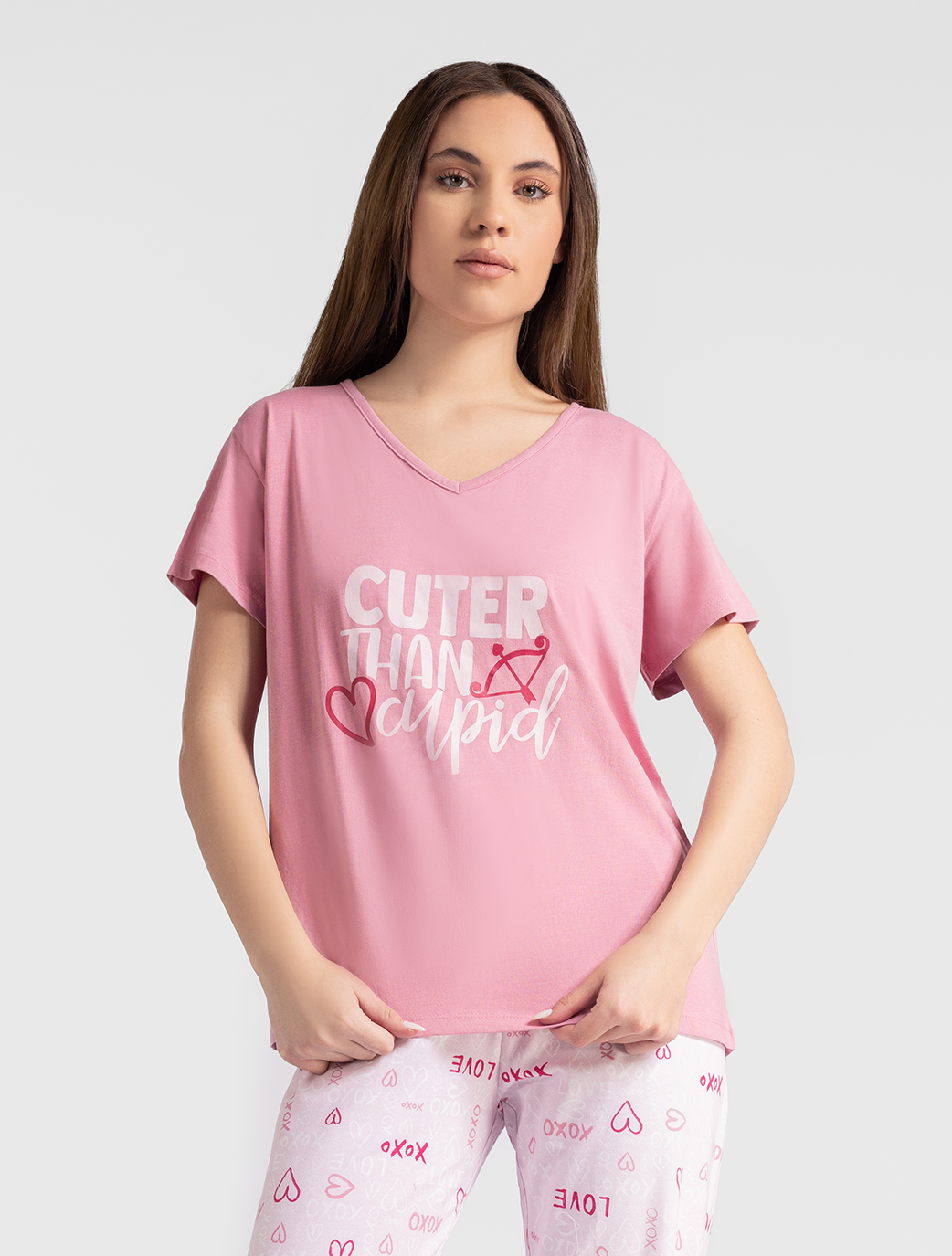 Embrace the Cupid vibes this season with our adorable pajama T-shirt. Unwind in style and fall in love with its cute design, perfect for relaxing and enjoying cozy moments.