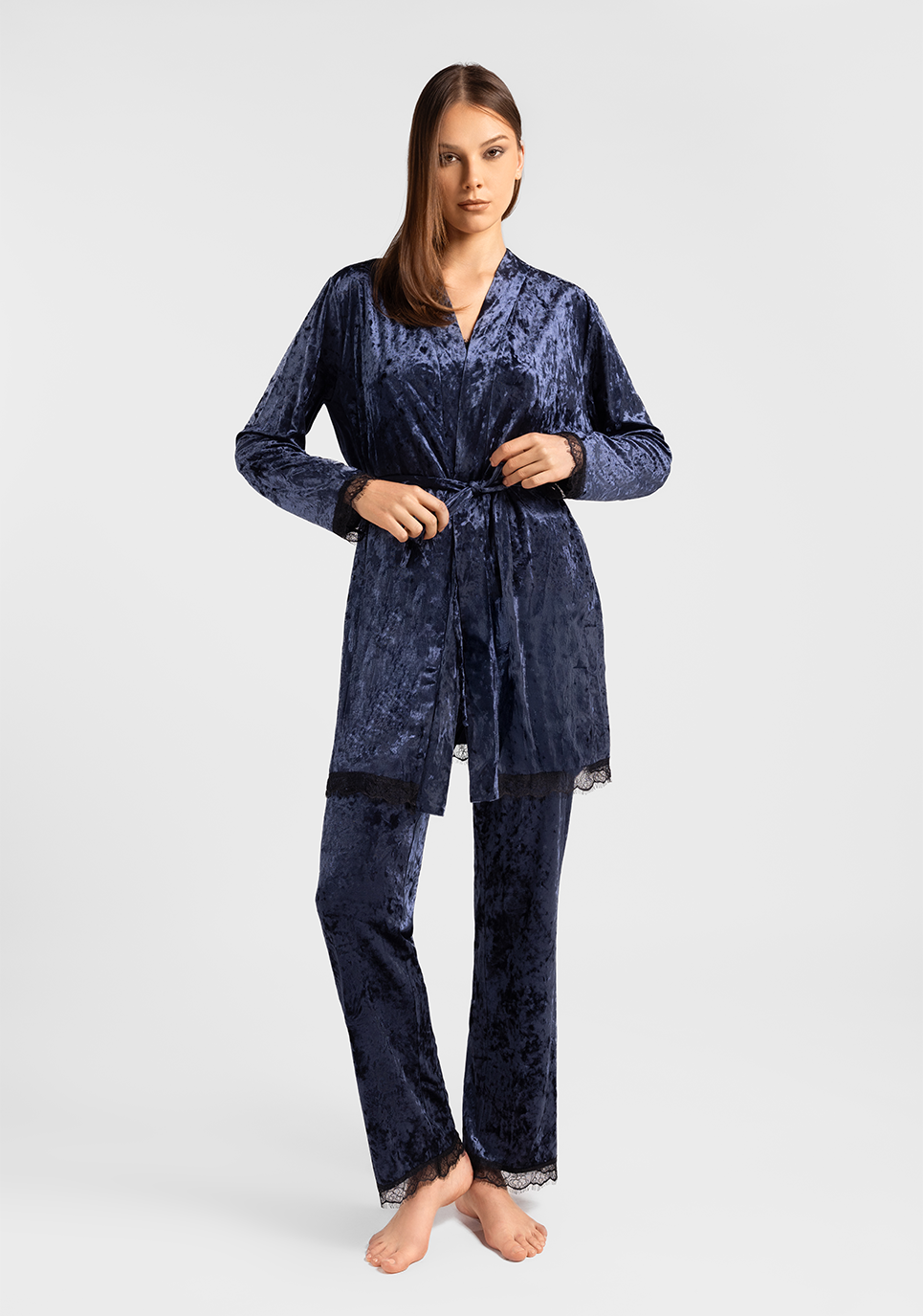Elevate your loungewear with this luxurious sapphire navy velvet robe. Featuring a flowing silhouette, delicate lace-trims, and a removable waist tie, it offers both elegance and comfort perfect for wrapping yourself in warmth and style.