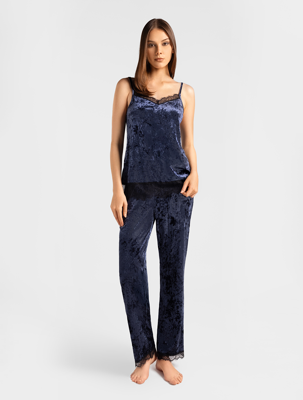 Sumptuously soft velvet in a deep sapphire navy shade defines this elegant pajama set. The relaxed-fit top showcases an intriguing, laced neckline, paired perfectly with straight-leg pants featuring a comfortable elastic waistband. Together, they blend timeless style with luxurious comfort ideal for restful nights or stylish lounging.
