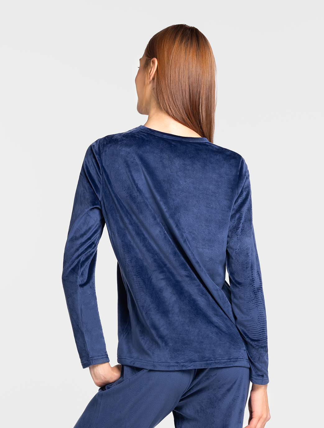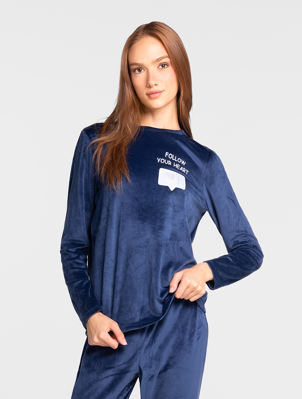 Embrace cozy comfort with the Follower Top, crafted from soft super fleece in a rich navy color. This warm pajama top features a playful and inspiring “Follow Your Heart” graphic with sparkling silver accents, adding a trendy and uplifting vibe to your loungewear. Perfect for relaxing at home or chilly nights, the Follower Top combines plush fabric and stylish design for all-day comfort.