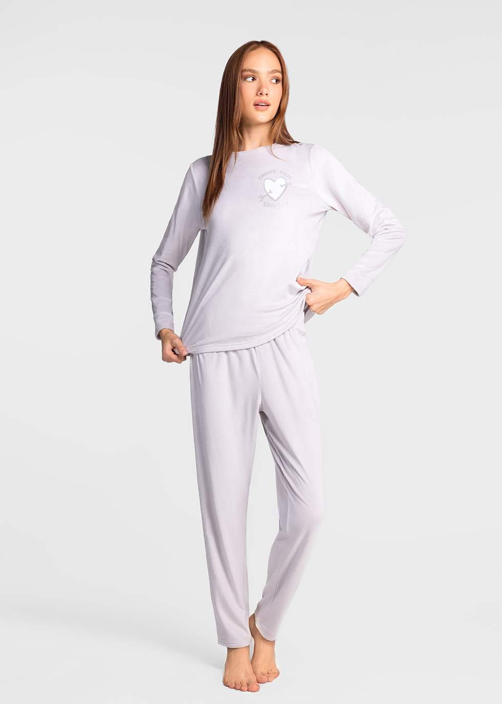Soulmate Pant is made from the same plush, light grey super fleece fabric as the Soulmate Top, offering ultimate comfort and warmth. Designed with a relaxed fit, these pants are perfect for lounging or sleeping, providing softness and coziness for all-day comfort. Pair them with the Soulmate Top for a complete and adorable pajama set.