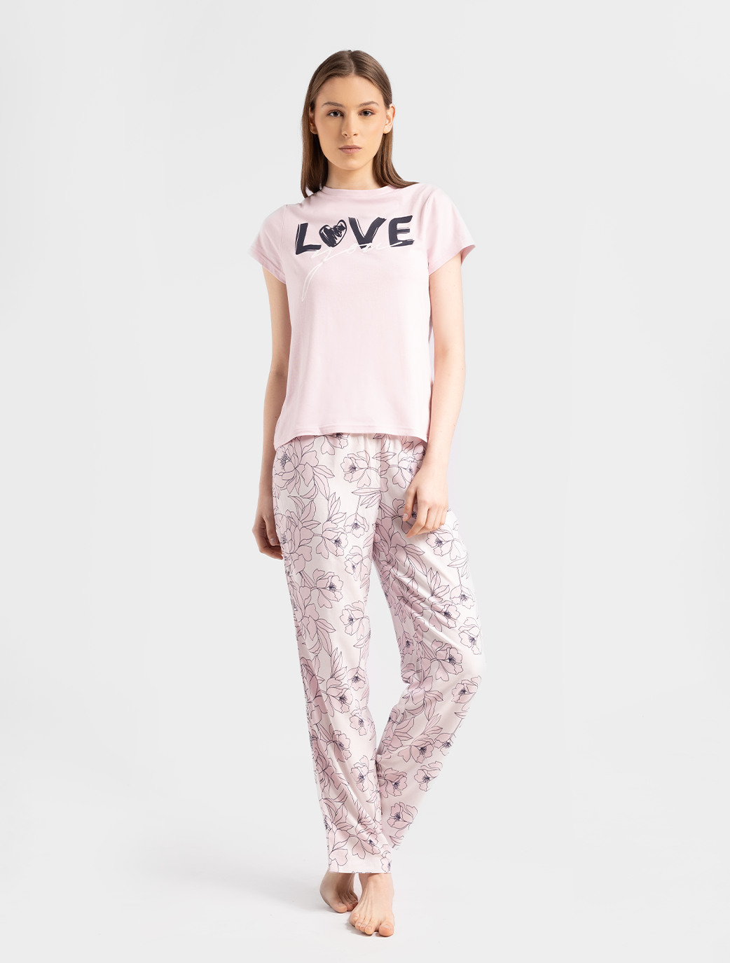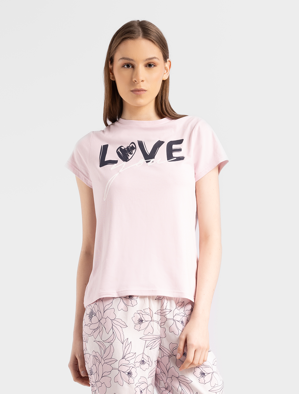 This light pink viscose t-shirt brings comfort and sweetness together with its Love You quote. The soft, flowy fabric drapes beautifully on the body, ensuring you stay comfortable while lounging or sleeping. It's the perfect piece for a relaxed, cozy look with a touch of heartwarming charm.