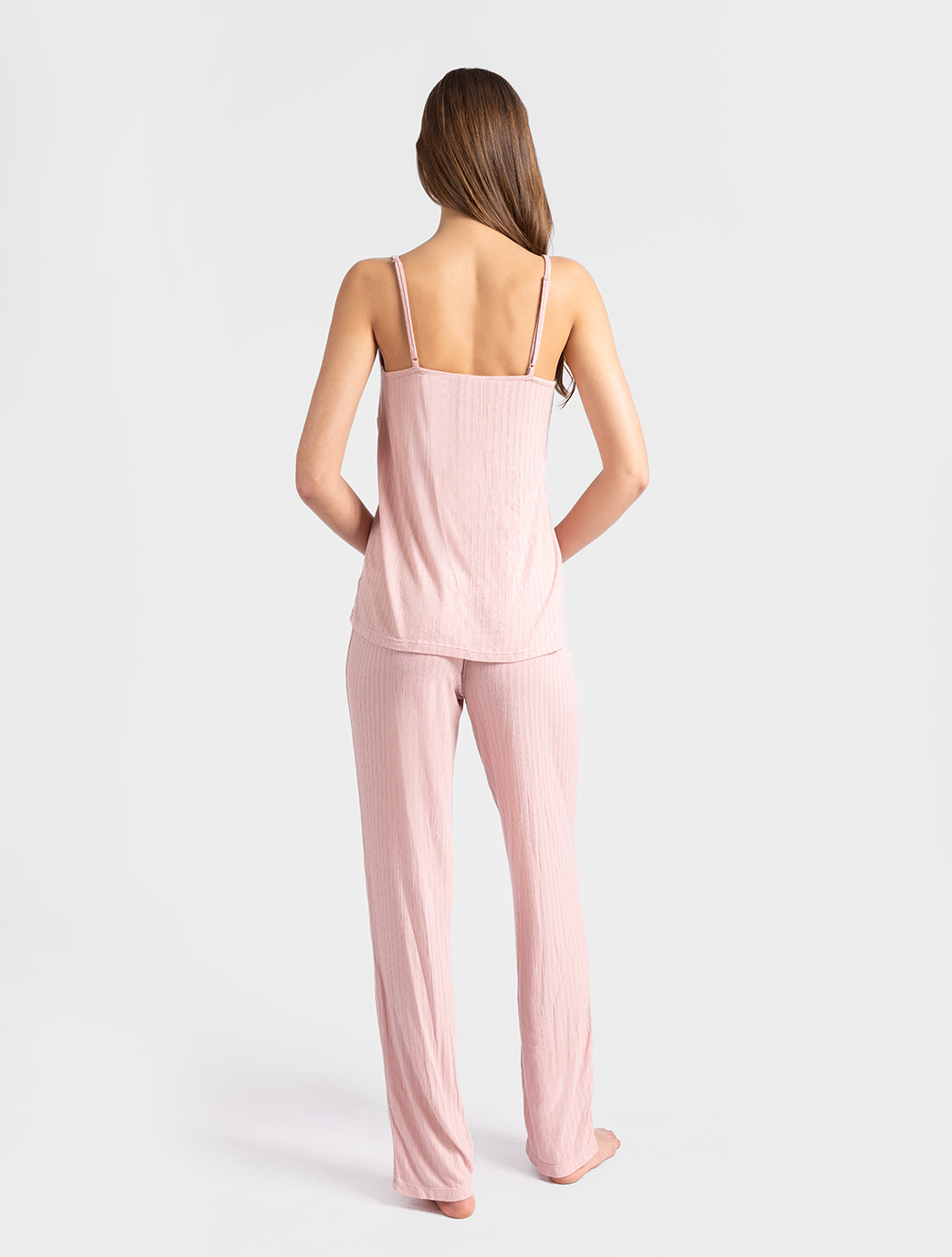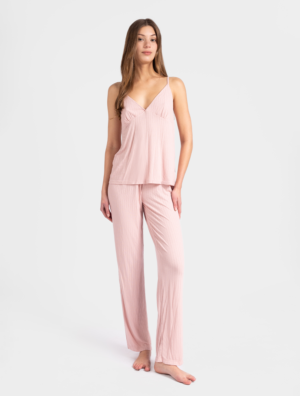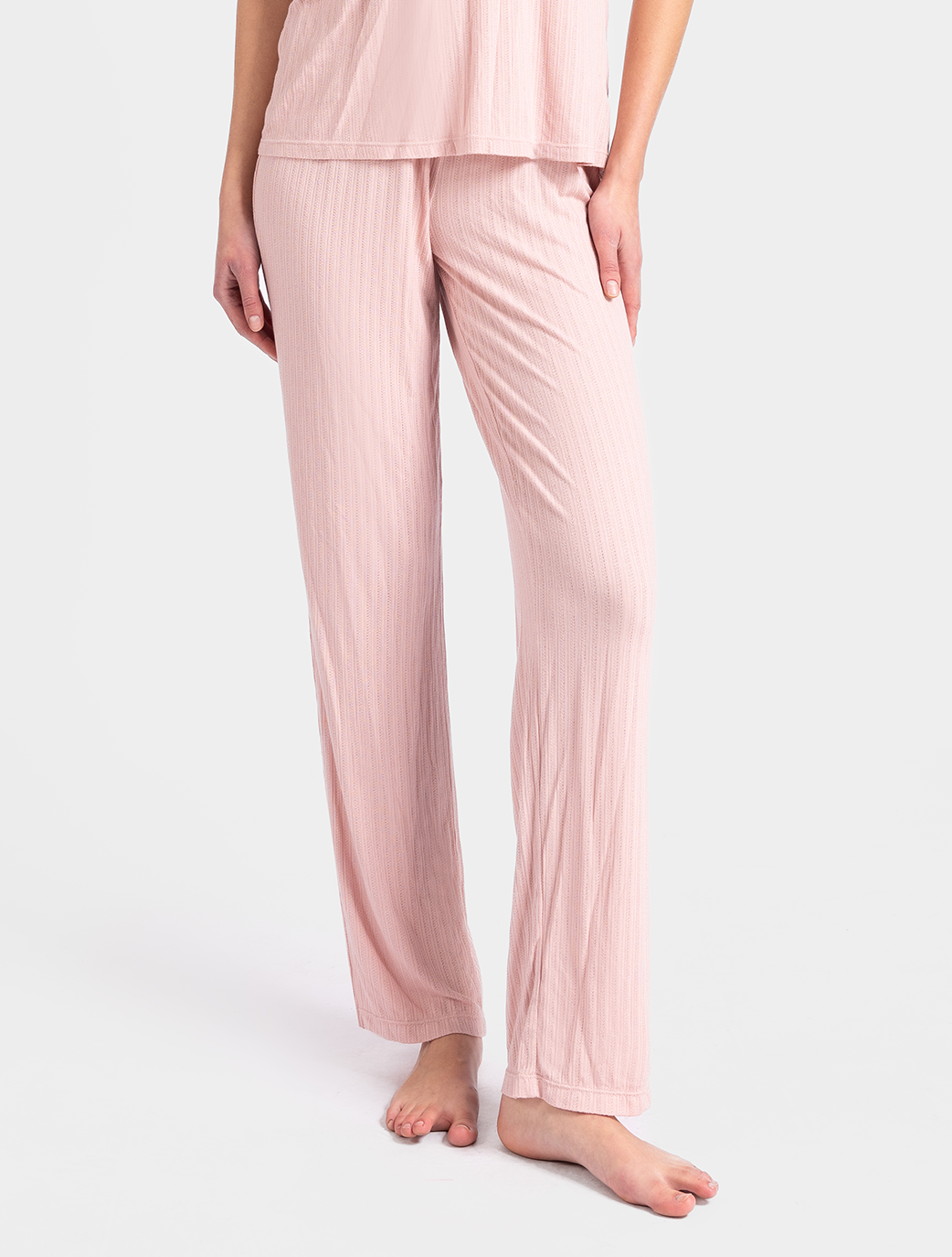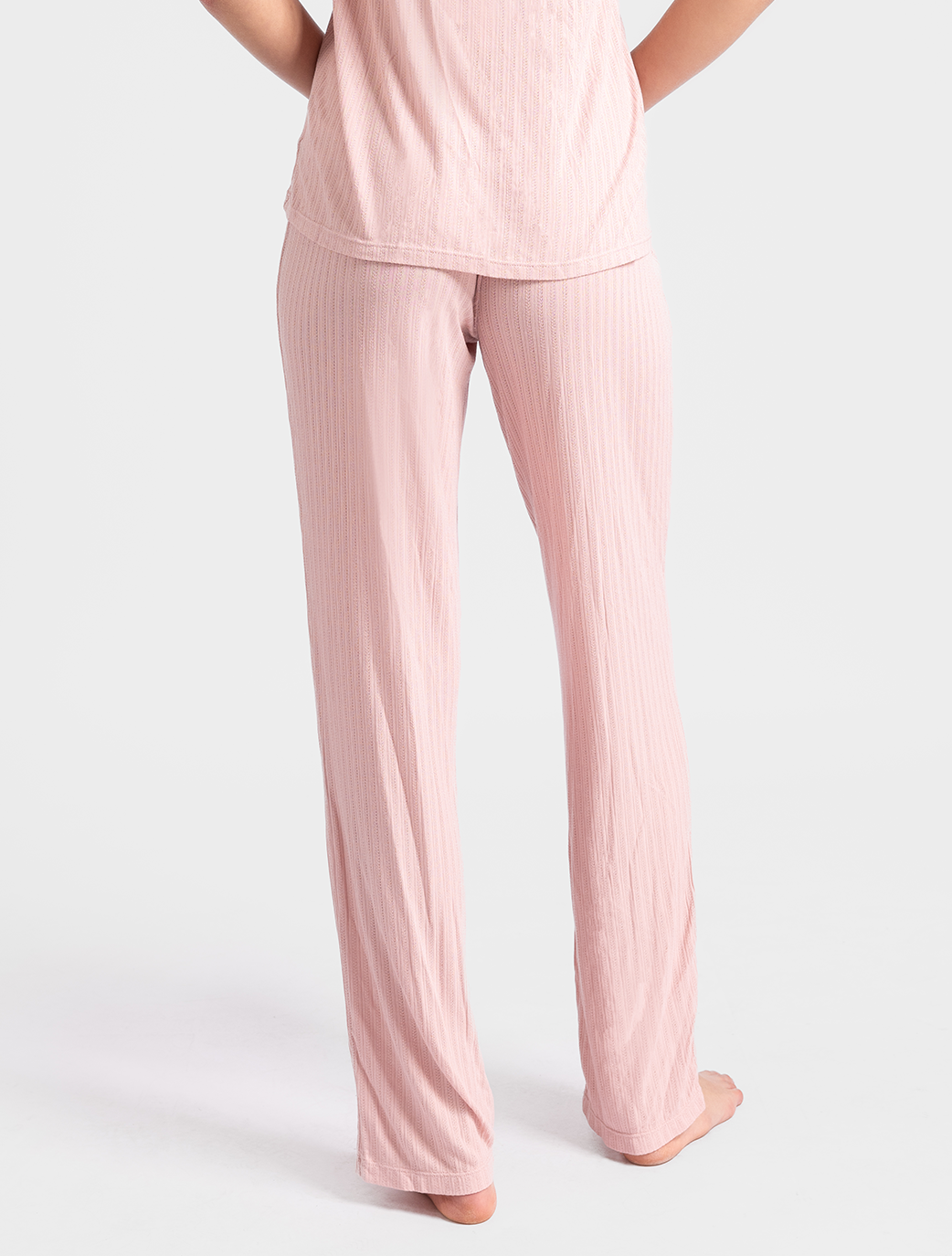 Available in a soft blush color that offer ultimate comfort and effortless style. Made from breathable, lightweight fabric, they provide a cozy, relaxed fit with a subtle ribbed texture for added sophistication. Perfect for lounging or a peaceful night's sleep, these pants combine luxury and ease in one stylish design.